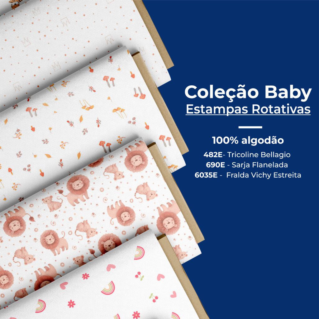 A Coleção Baby – 100% Algodão reúne tecidos desenvolvidos a partir de matérias-primas selecionadas, como algodão e linho, garantindo um toque macio, respirabilidade e alta durabilidade. Com a aplicação da estamparia rotativa, essas bases se destacam ainda mais, permitindo a reprodução precisa de estampas contínuas, com excelente definição e durabilidade.