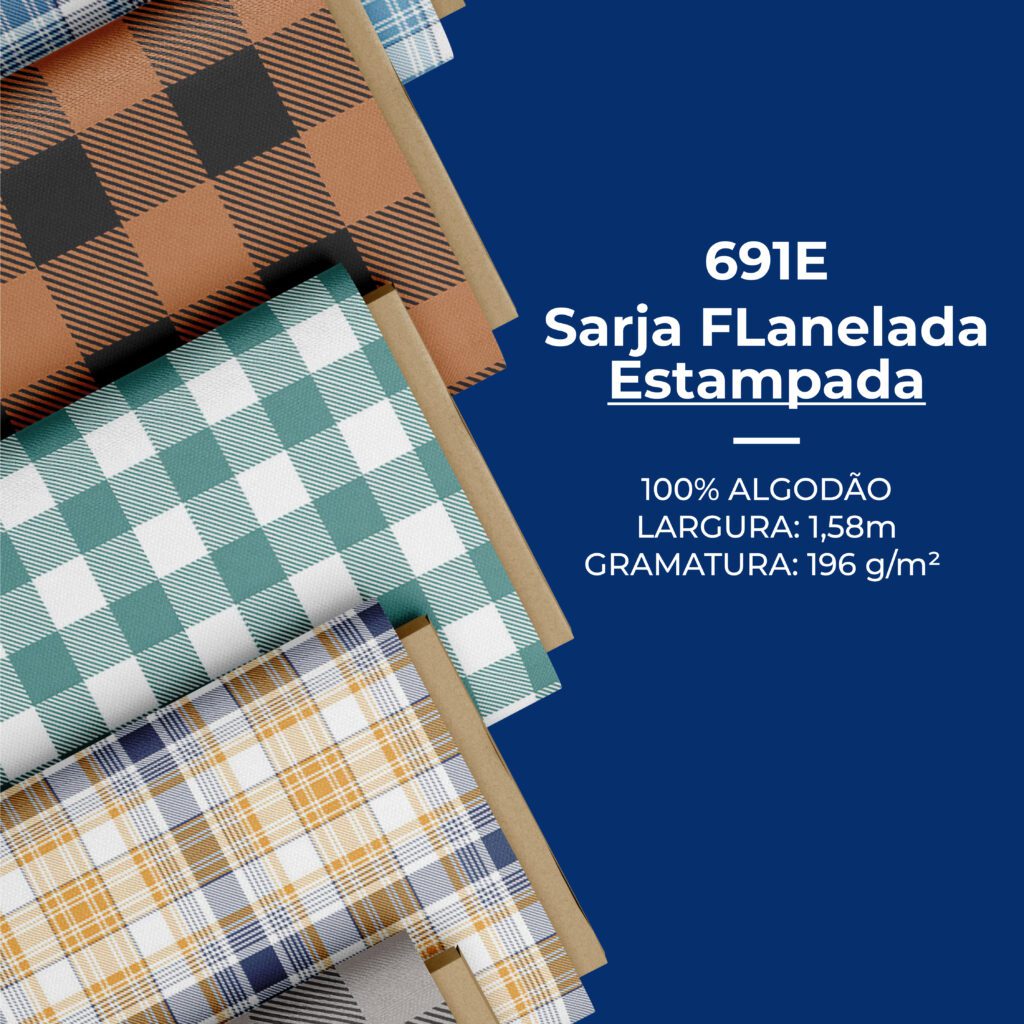 A Sarja Flanelada Estampada une a resistência da sarja com o toque macio da flanela. Com 1,58m de largura e 196g/m², é um tecido versátil, quente e confortável — perfeito para peças do dia a dia.